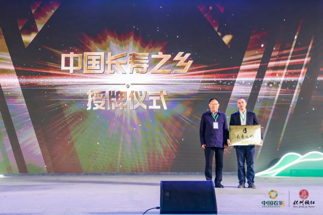 中国老年学和老年医学学会常务副秘书长、长寿之乡事业部主任杨勇现场宣读《关于授予化州市“长寿之乡”称号的决定》,中共化州市委书记邓泽友从中国老年学和老年医学学会会长、健康中国行动推进委员会专家咨询委员会委员刘维林的手中,接过“中国长寿之乡”这个属于化州市的又一“国字号”殊荣。