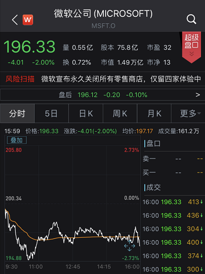 当天,微软股价大跌2%,报收196.33美元,市值蒸发304.08亿美元,折合人民币为2152亿元。